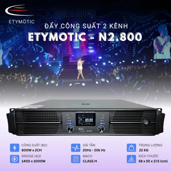 – Đẩy Etymotic N2.800 là đẩy 2 kênh, sử dụng công nghệ Class H , công suất 800W / (8Ω) * 2 kênh giúp khuếch đại âm thanh rõ ràng, mạnh mẽ , thích hợp cho dàn karaoke gia đình kinh doanh, hệ thống âm thanh sân khấu, hội trường.