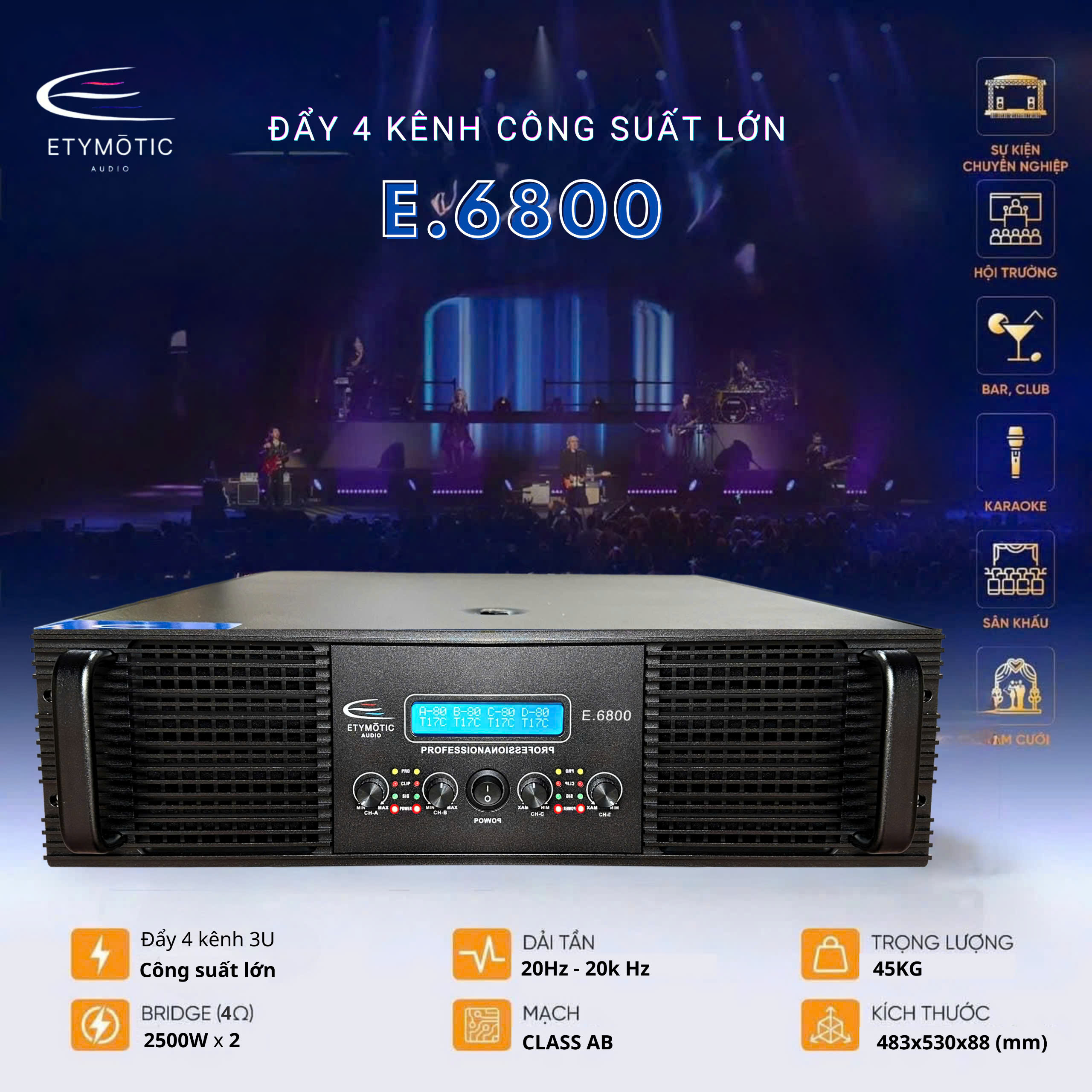 Đẩy công suất ETYMOTIC – E.6800 là dòng đẩy 4 kênh có công suất khủng chuyên dành cho các dàn âm thanh sự kiện, âm thanh chuyên nghiệp, sân khấu lớn, bar,…