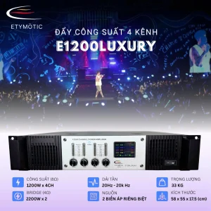 – Đẩy Etymotic E1200Luxury là đẩy 4 kênh, sử dụng công nghệ Class TD, nguồn 2 biến áp riêng biệt , công suất lớn 1200W / (8Ω) * 4 kênh giúp khuếch đại âm thanh rõ ràng, mạnh mẽ , thích hợp cho dàn karaoke kinh doanh, hệ thống âm thanh sân khấu, hội trường.