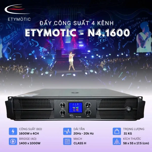 – Đẩy Etymotic N4.1600 là đẩy 4 kênh, sử dụng công nghệ Class H , công suất lớn 1600W / (8Ω) * 4 kênh giúp khuếch đại âm thanh rõ ràng, mạnh mẽ , thích hợp cho dàn karaoke kinh doanh, hệ thống âm thanh sân khấu, hội trường.